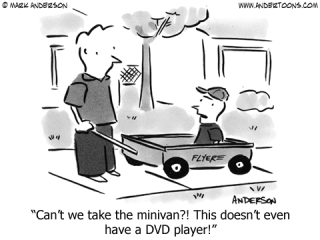 Well, sorta. Being at the dealership reminded me of the other times we had purchased cars with kids in tow. It usually involved Nina and I tag-teaming so that one of us could entertain the increasingly impatient children long enough for the other to glean information or make progress on a deal with the salespeople. This time my tag team partner was Pete. But I didn’t drag him along because I needed childcare (I don’t have that kind of Machiavellian forethought, sadly). The reason I asked Pete to come is that I trust his judgment entirely on car buying. He is completely indifferent to the sex appeal of a car. Not that he doesn’t appreciate a good ride, but he can spot value and reliability and, above all, functionality, through the haze of car trappings better than anyone I’ve ever known. We used to tease him for buying a purple Nissan Quest whose shade of paint would have better suited underthings at Victoria’s Secret than a family automobile. But darned if that car wasn’t extremely reliable and exactly what Pete needed.